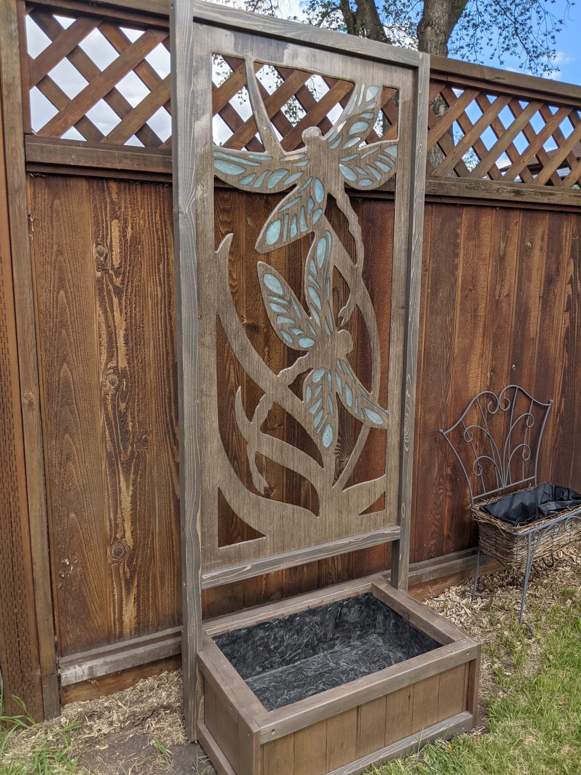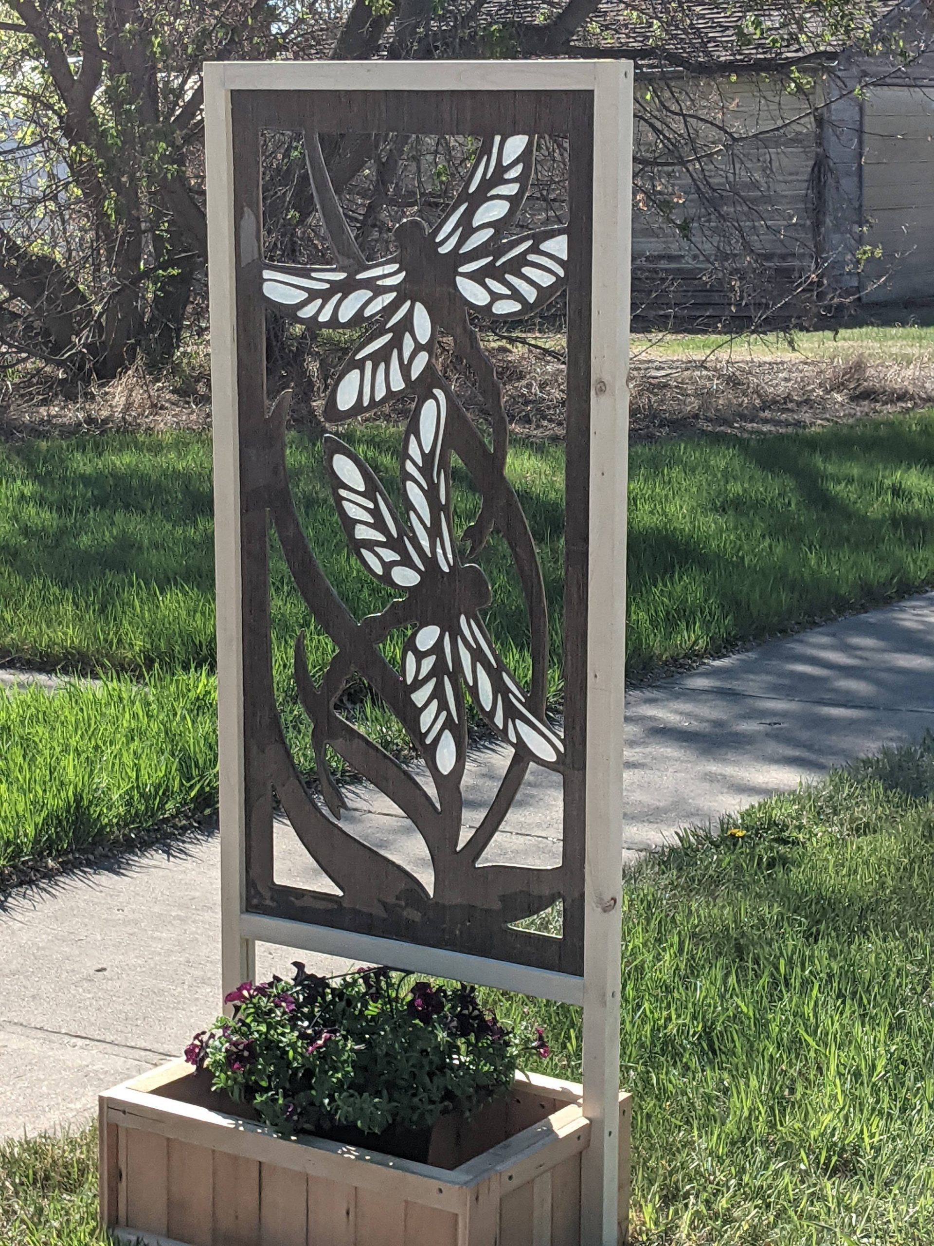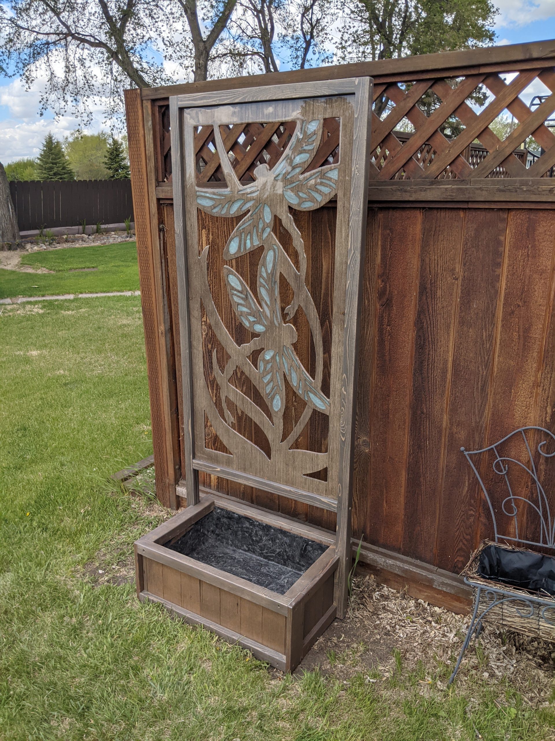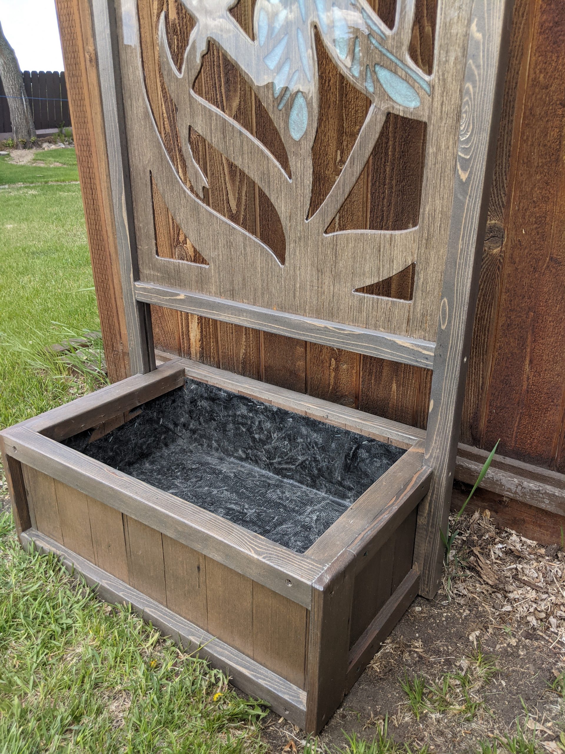 Attached to a planter box approximately 2 feet wide by 1.5 feet long, and 10 inches tall.